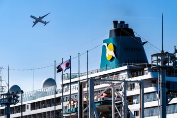 かつて飛鳥と呼ばれた船が、アマデアとして東京港に現れました。その白い船体と、遠くに見える飛行機が、海の上の道で交差していました。