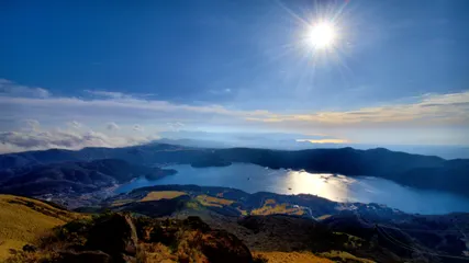 芦ノ湖 先日、箱根芦ノ湖の湖畔に建つ山のホテルに行って来ましたが、併せて駒ケ岳にケーブルカーで登ってきました。駒ヶ岳の標高1.365mから見下ろした芦ノ湖の全風景です。DXフォーマットで10mmのレンズで撮影しています。^^16:9でトリミングしていますので拡大するとその場にいる様な臨場感があると思います。
