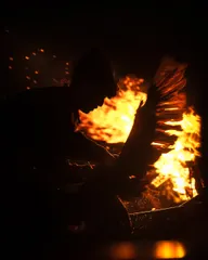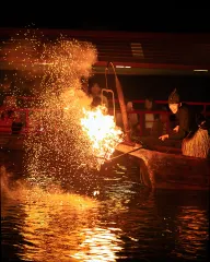 ツンツンタイム! 女鵜匠と炎の躍動 ツンツンタイム! 伝統の木曽川鵜飼で、女性鵜匠さんの躍動感あふれる瞬間を捉えました。暗闇を切り裂くようなかがり火の炎と、激しく飛び散る火の粉、水面に映る光が、まさに「生きた古典絵巻」。鵜匠と鵜の息の合った迫力ある漁は、一瞬たりとも見逃せません。