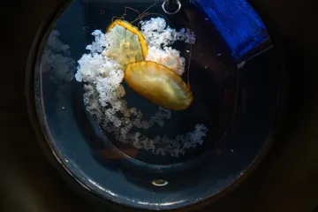 廻る 船の窓のような形の水槽にクラゲがぐるぐるぐーるぐるまわって漂っていました。目が回ることはないのでしょうか