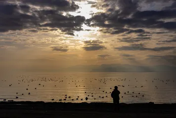 琵琶湖の夕日と水鳥と