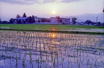 田は湖沼のように変身 田は湖沼のように変身。一株ずつ植えるははるか昔。今年はどんな風景か。