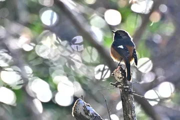 NEW ジョウビタキ 頭に少し枝が被り逆光で少々ハレーションもありますが輝くジョウビタキがすぽっとを浴びてるスターのように輝いていたので撮りました。Z50Ⅱ Z100-400f4.5~5.6SVR+TC1.4