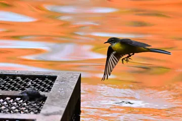 奇跡レイ 左端のブロックに着地する瞬間を池面に映える紅葉をバックに捉えました。池の波模様も美しくまさに奇跡の1枚でした、キセキレイと奇跡をもじってタイトルを「奇跡レイ」としました。Z50Ⅱ 100‐400+TC1,4