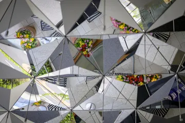 ビルのエントランスの天井が鏡でできており、そこに映る景色がまるで万華鏡のように感じます。