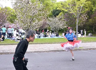 大阪城公園の桜満開の中軽やかに踊る女性のリズムはパートナーの男性とも、お花見の人々ともリズムが合わなくも届かなくても踊っています。