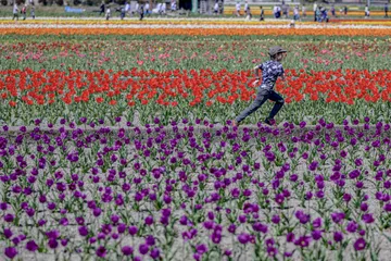 チューリップ畑の中を、少年が楽しそうに走っていました。