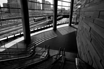 カーブと直線 ニュウマン高縄は、窓も壁もそしてエスカレーターも、カーブと直線を上手く組み合わせてデザインされており、電車が走ってくると一幅のモザイク絵のように見える。