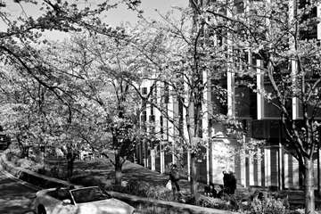 真っ白なビルを背景に咲き誇るソメイヨシノ、観光客は入れないのだろう。数人の関係者がゆったりと遅い昼ご飯を食べている様子、昔の映画の一コマのようだった。