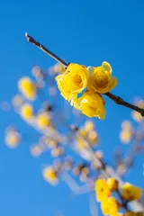 ロウバイ 2 翌日、朝日があたりほぼ快晴。再度、ロウバイ撮影に向かう。逆光は撮れなかった。青空に咲くロウバイは美しかった。一枚目は回りにロウバイのボケをいれて奥の花を撮ったもの。