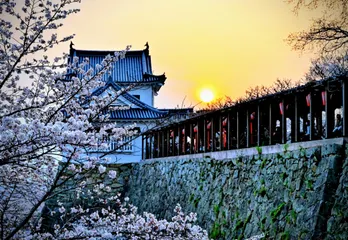 夕暮れ時の城と桜