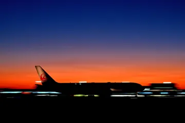 夕暮れの空港で、離陸する飛行機を低速(1/20秒)で流し撮りしました。Nikon Z9 NIKKOR Z 24-120mm f/4 S1/20秒 f/5.6 ISO800