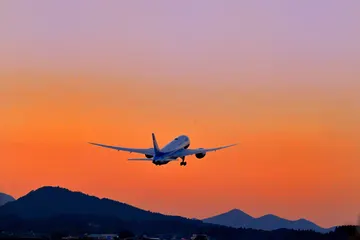 夕陽に染まる空への離陸 夕陽に染まる空へ飛行機が飛び立って行きました。Nikon Z9 NIKKOR Z 100-400mm f/4.5ー5.6 VR S1/1000秒 f/11 ISO2500