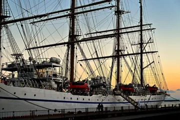 帆船「日本丸」 夕暮れ、うっすらとオレンジ色に染まる空をバックに鹿児島本港に停泊中の帆船「日本丸」を撮影しました。 Nikon Z9 NIKKOR Z 24~120mm f/4 S1/80 f/8 ISO1000