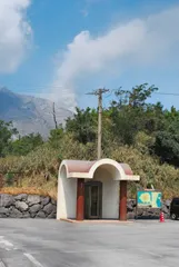 桜島の有村溶岩展望所にあった電話ボックスです。シェルター兼用のようです。googleでは残っていますが、現存するかは判りません。追伸:背景は昭和火口の噴煙です。吹き上がった直後です。
