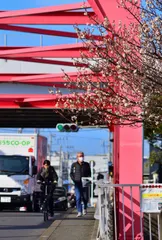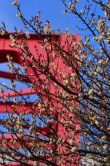 冬色チャレンジ」赤い橋と白い梅(2) お散歩写真です。冬も今から本番ですが、季節は、どんどん変わっていきますね。冬の花、春の序章、梅の花が咲き始めました。^^