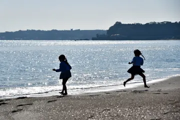 少女が2人、寄せては返す波と楽しそうに遊んでいたの姿が可愛らしくほっこり( ´ー`)