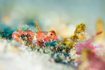 ニシキフウライウオというカラフルな細い体に小さなトゲのようなものが沢山出ている魚です。あまり泳ぎ回らずにサンゴや海藻に寄り添って擬態しています。 バックにあるヤギ(ヤギは漢字では「海楊」と書くサンゴの仲間です)と同じような色形なので、水中では非常に見分け難く、見事な擬態です。 こ