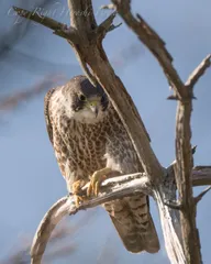 手前の枝が・・・ 「ハヤブサ」と思うが、ひょっとすると「チョウゲンボウ?」ご存知の方教えて下さい。眼光鋭く獲物を見据えている!と思いきや視線の先には「カラス」カラスが色々とちょっかいを出してくるので睨みつけてる場面。でも結局「ハヤブサ」が負けて飛び出してしまった・・・「カラス」最強か!?