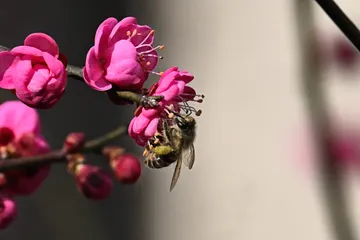 庭の紅梅と蜜蜂