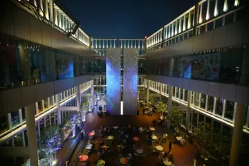 「夕陽を追いかけて!(後編)」です。 陽が沈むと、今度は夜の部の始まりです。中央、北、北西の角、南、北東の角のそれぞれの壁面にプロジェクションマッピングが映し出されます。 アイキャッチ画像は、58階 天空庭園 中央の壁に映し出されたプロジェクションマッピングの様子です。